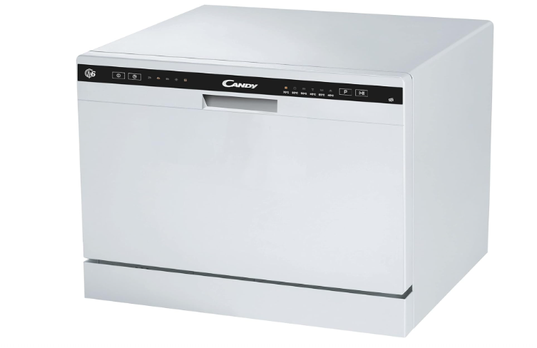 Es el turno para hablar del mini lavavajillas Candy CDCP 6 que también se presenta como una gran opción en el mercado para aquellos que cuentan con poco espacio en su cocina. Tiene capacidad para 6 servicios y es muy fácil de instalar sobre la encimera, ahorrando espacio sin comprometer la eficiencia. Tiene un consumo de agua de solo 6,5 litros por ciclo con su modo eco y una eficiencia energética clase F, algo baja si lo comparamos con otros modelos. Su diseño intuitivo, tope patentado y sistema antidesbordamiento garantizan una experiencia sin contratiempos. Ofrece 6 ciclos de lavado, adaptándose a diferentes tipos de vajilla, y la función de “Inicio Diferido” para mayor flexibilidad. Nos parece que por todo ello es uno de los modelos que tener presente a la hora de comprar tu mini lavavajillas.