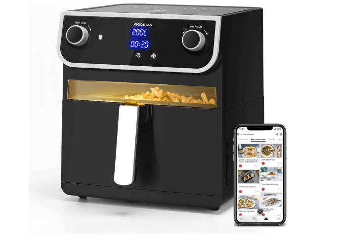 Si buscas una airfryer de gran capacidad nuestra recomendación es la Aigostar Joy ya que cuenta con 8 litros y ofrece gran comodidad y versatilidad en la cocina. Cuenta con una pequeña pantalla de visualización para controlar los tiempos de cocción y 1700 W de potencia, presentando 12 funciones preestablecidas y pantalla LED táctil. Su diseño único permite comprobar el estado de la cocción en cualquier momento, además está equipado con patas deslizantes y tecnología de circulación de aire caliente.