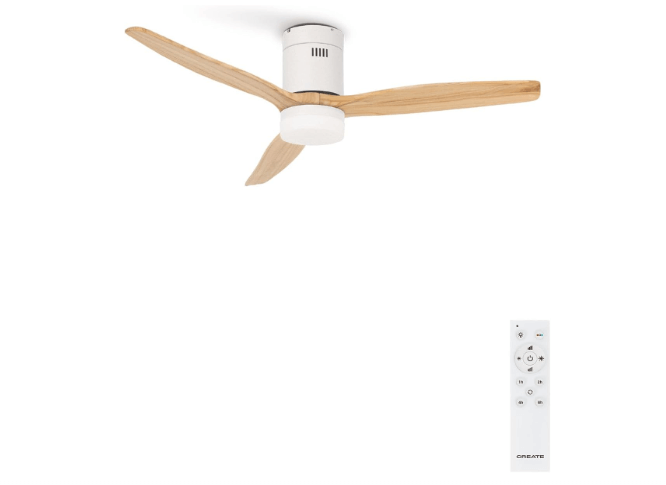Una marca de confianza y garantía de buena relación calidad/precio es Create. En su catálogo cuenta con varios ventiladores de techo, pero el WindCalm sería nuestra opción elegida. Su funcionamiento es silencioso y eficiente gracias al motor DC que incorpora. Es un motor de cobre que garantiza alta eficiencia energética y nos ofrece seis velocidades.