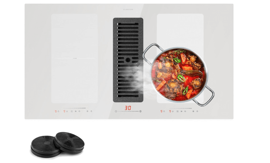 Abrimos la lista con la que nos parece la mejor opción del mercado, de la mano de una de las marcas más conocidas del momento, Klarstein. Esta placa de inducción vitrocerámica 2 en 1 redefine la eficiencia en la cocina al combinar una campana extractora y la placa en un sólo dispositivo, ahorrando espacio y añadiendo elegancia moderna.