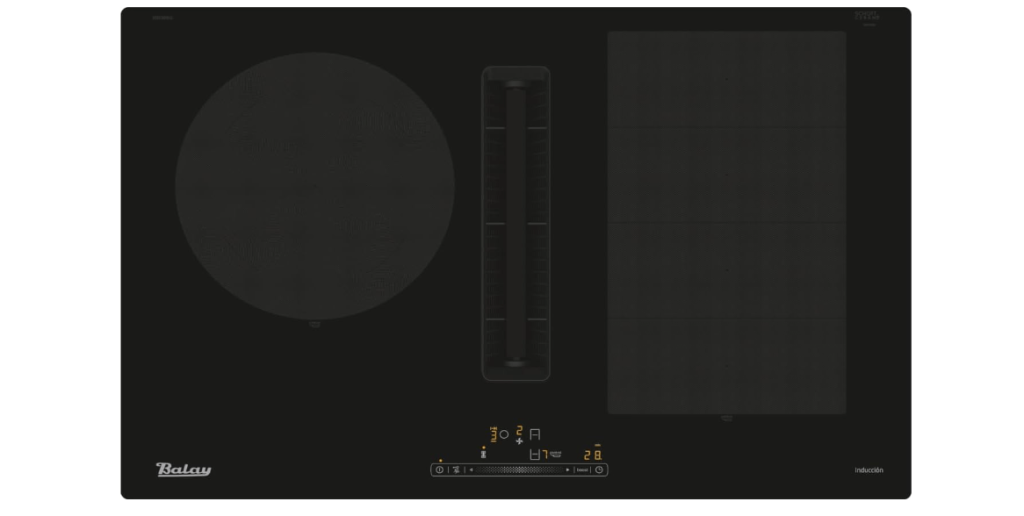 Una muy buena opción nos parece también la que nos trae la marca española Balay con su modelo E3BC989LU que destaca por tener una potente extracción de 600 m3/h y sus tres zonas de inducción, incluida una gigante de 28 cm, además de dos zonas flexibles.