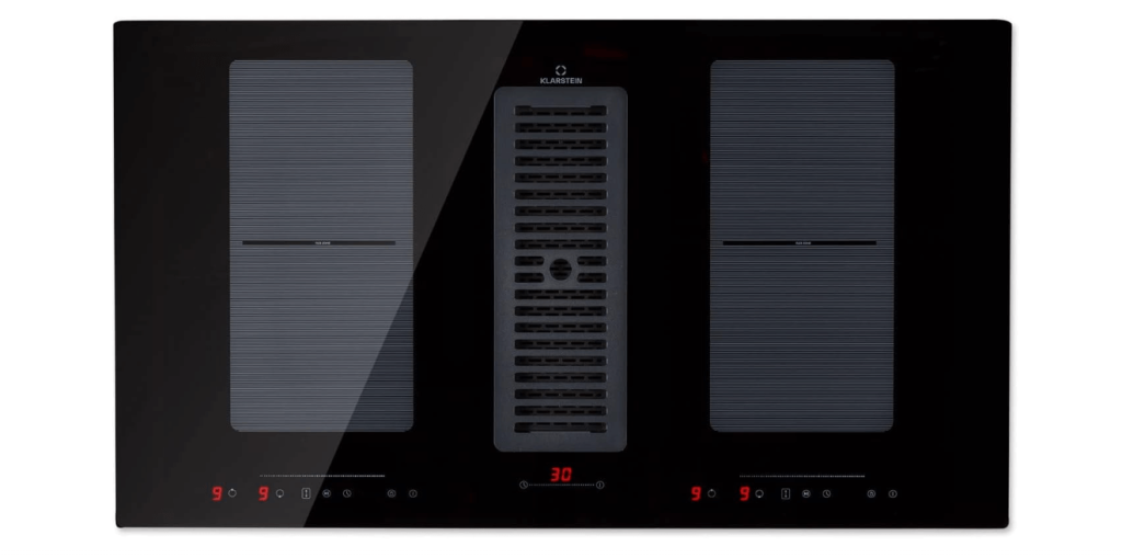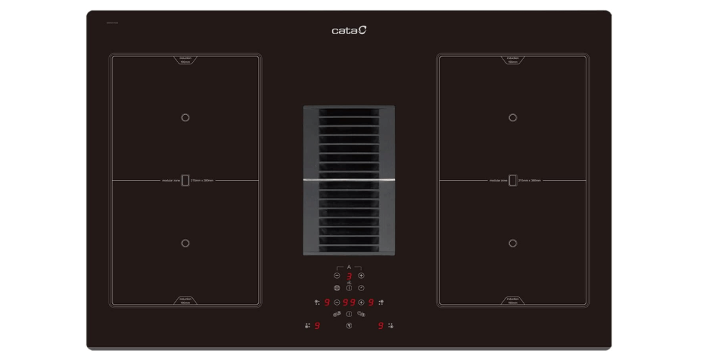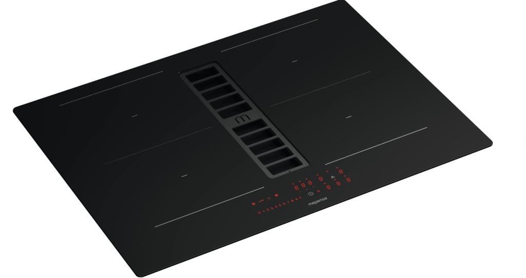 - Placas de inducción con extractor integrado en el centro: este tipo de placas suelen tener el extractor ubicado en el centro, justo encima de las zonas de cocción. Esta disposición permite una extracción eficiente de humos y olores desde el punto de origen, lo que garantiza una cocina más limpia y libre de olores.