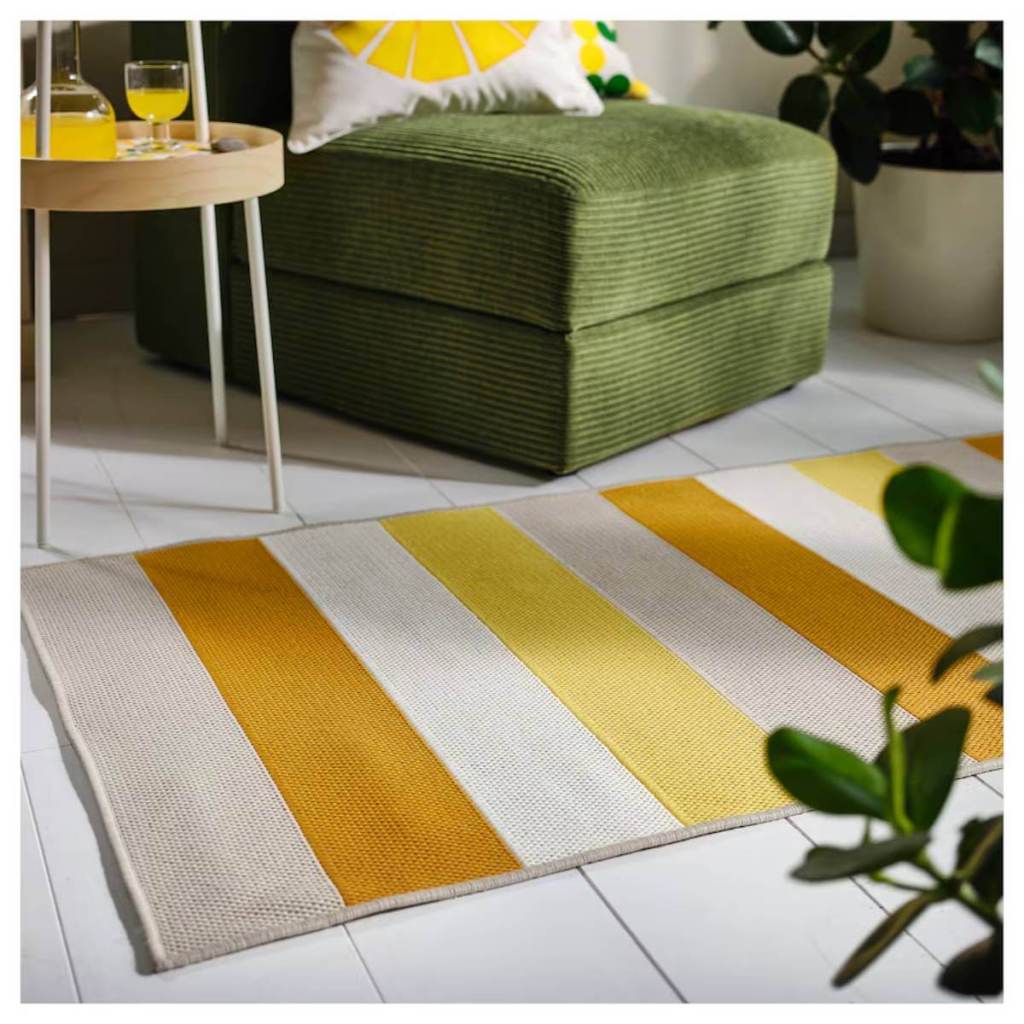 De todos los artículos llamativos que forman parte de esta línea de Ikea nos quedamos con esta alfombra de exterior rayada, con tonos amarillos y anaranjados, que ilumina y alegra cualquier espacio de asueto en terrazas, jardines y patios. Como alfombra exterior que es, está fabricada en un material duradero y resistente a las manchas. Mide 80x200 cm y cuesta 24,99 euros.