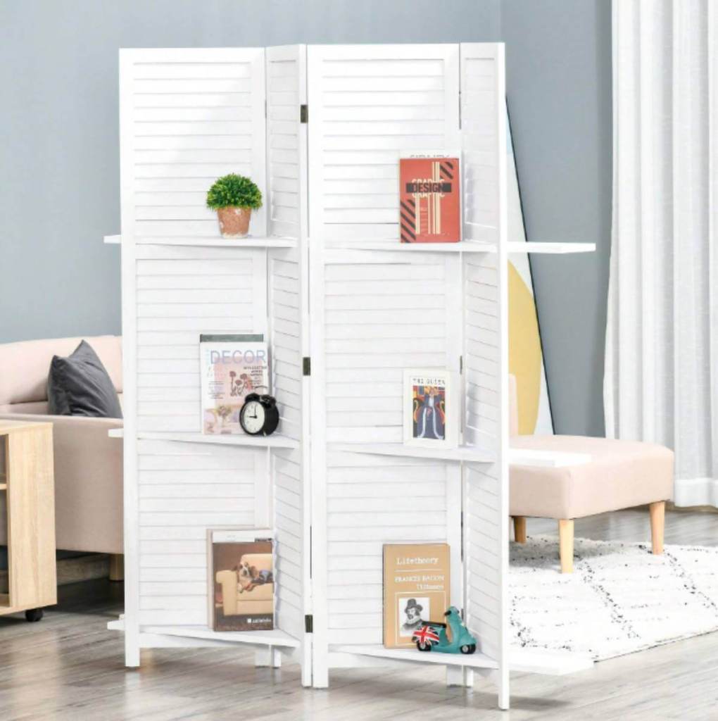 Hay opciones más económicas, como este biombo estantería de Shein. fabricado en madera de cuatro paneles, tiene como elemento diferenciador los estantes extraíbles que convierten al biombo en una estantería en una de sus dos caras.