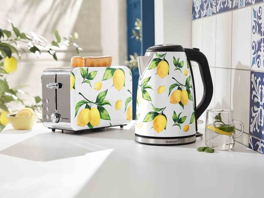 En cuanto a los aparatos eléctricos para la cocina, también encontramos algunos que hacen juego y que tienen estampados llamativos. Es el caso de esta tostadora con limones, con un estilo que nos transporta al sur de Italia, que es la perfecta compañera de este hervidor de agua de 3100 W con base de acero inoxidable y resistencia oculta (27,99 euros).