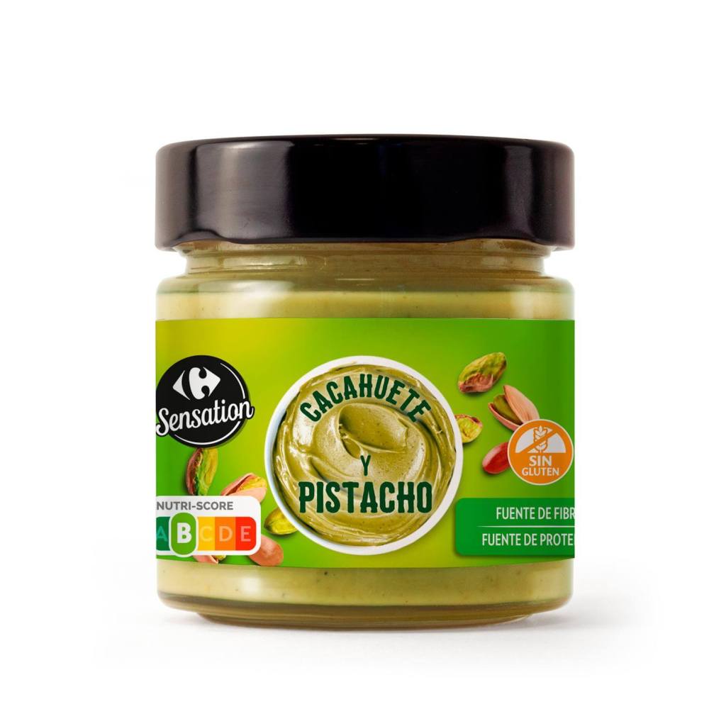 En Carrefour tienes una crema untable que combina el pistacho con el cacahuete. Se trata de una fuente de fibra, con una composición del 55% de cacahuete y un 45% de pistacho. Estos son los ingredientes principales, aunque el fabricante advierte que "puede contener trazas de leche, soja y otros frutos de cáscara". Su precio es de 4,95 euros.