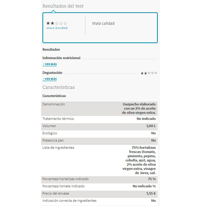 Un gazpacho envasado con un precio de 1,99 euros y un 94,4 % de hortalizas indicadas. A pesar de eso, la OCU determina que tiene un sabor vegetal desagradable con retrogusto avinagrado y metálico.