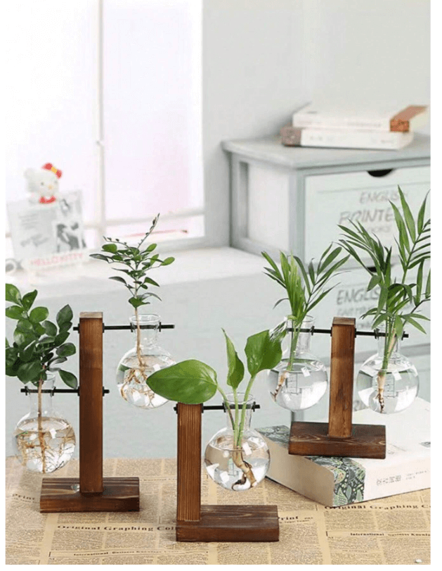 El sistema hidropónico es otra manera de tener plantas en tu hogar. Es ideal para plantas acuáticas o futuras vegetaciones que necesitan un tiempo bajo el agua para que salga la raíz. Se trata de un soporte de madera que sujeta un jarrón de cristal. El precio es de 6 euros.