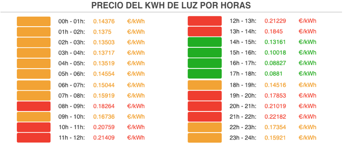 Según la Red Eléctrica de España, por franjas horarias, el precio mínimo, de 35 euros/MWh, se dará entre las 17.00 y las 18.00 horas, mientras que el resto del día se mantiene a precio medio y alto.