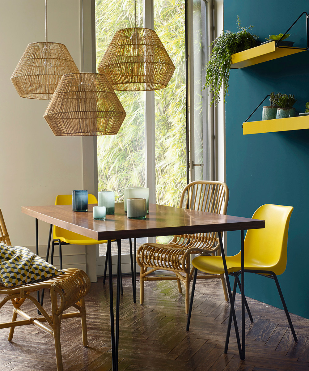 El amarillo no se utiliza mucho en interiorismo porque, la verdad, no es un color fácil a la hora de hacer combinaciones. Por otro lado, es un tono capaz de crear ambientes alegres y muy luminosos. Nuestra propuesta siempre pasa por introducir los elementos más arriesgados poco a poco para ver si funcionan. Pintar una sola paredes una idea. Un par de sillas turquesas contrastan y refuerzan. Fotos: La Redoute.