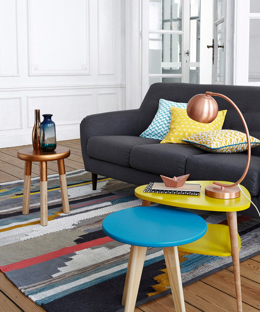 Cambia el chip y sustituye la clásica mesa de centro por dos o tres mesitas auxiliares más pequeñas porque te permiten jugar con la disposición y el color y ayudan a despejar el ambiente, sobre todo si falta espacio.