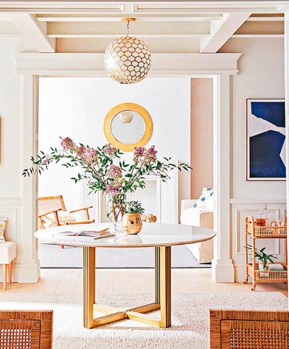 En la foto, puedes apreciar que, sobre un fondo neutro y predominantemente blanco, se utilizan algunas piezas en latón dorado para dar personalidad al ambiente. Encontramos este recurso en los espejos dorados, en la lámpara del techo y, sobre todo, en la mesa redonda central, que aporta un estilo mid century a la decoración de esta casa.
