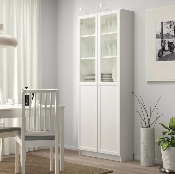 - Convertirla en vitrina: tienes hasta dos opciones distintas para convertir a tu estantería Billy en una elegante vitrina, perfecta para presidir el salón. Puedes colocar puertas de vidrio de arriba a abajo, de modo que todo el interior quede a la vista, o puedes colocar puertas de madera en la mitad inferior, obtenido mitad armario y mitad vitrina. Para elegir la opción que más te guste, busca las puertas de las líneas Oxberg.