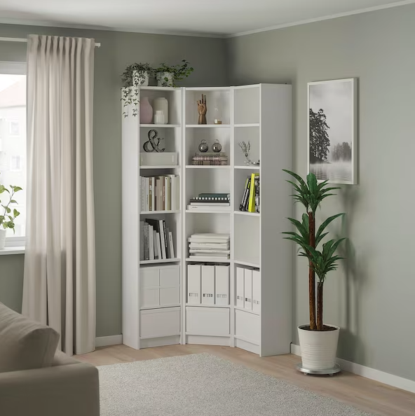 - Esquinera: a lo mejor estás pensando cómo resolver un esquinazo de la habitación donde no sabes qué poner y necesitas ganar espacio de almacenaje. Pues debes saber que Ikea tiene una solución ideal: un módulo para las esquinas de la línea Billy. Es perfecto, por ejemplo, para unir a dos Estanterias en forma de L aprovechando una esquina. Nadie te dirá que esa solución es la típica de Ikea y en cambio lo es.