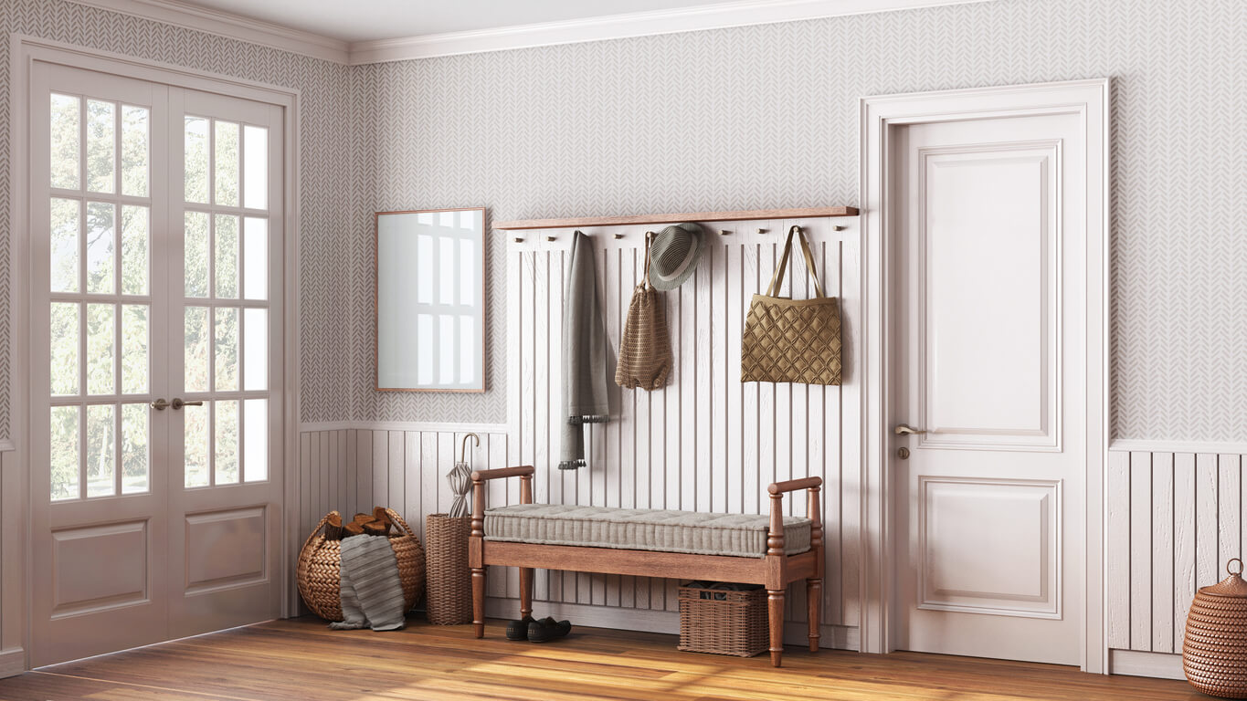 - Colócalo en la entrada principal para crear un espacio acogedor y funcional. Puedes combinarlo con un banco de madera para un look más completo.