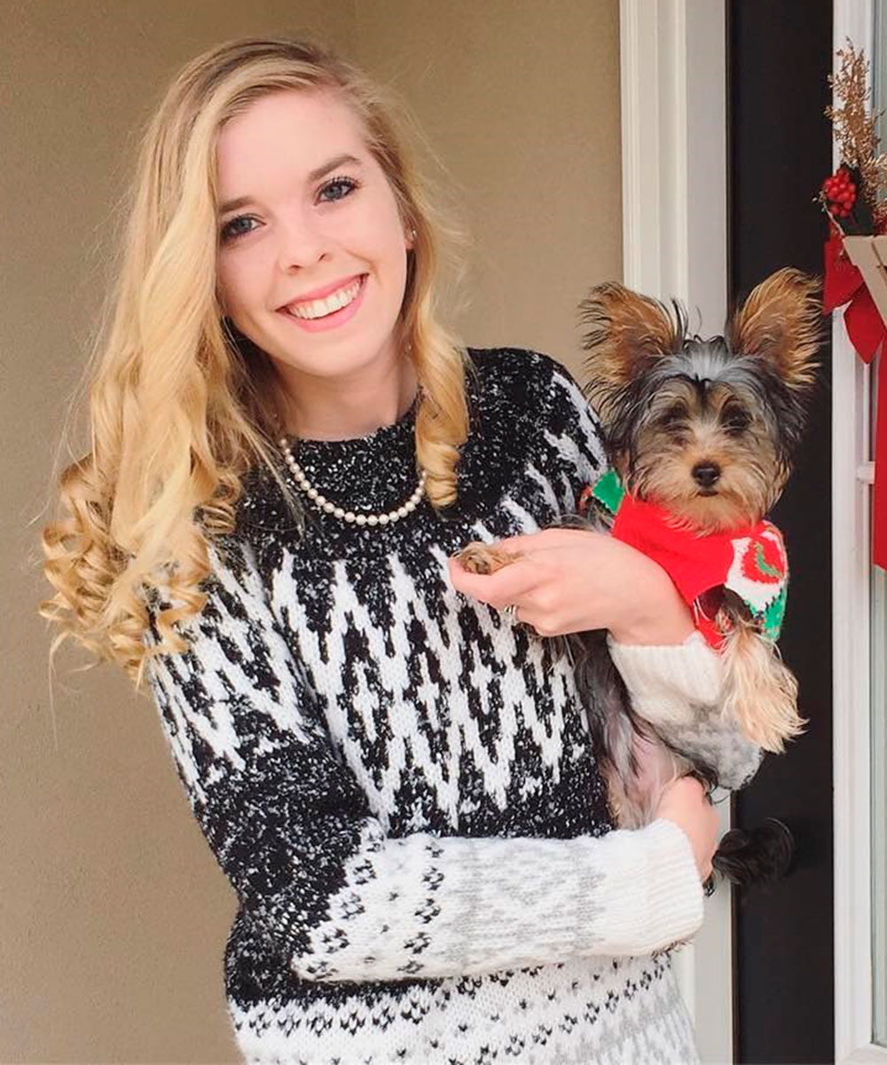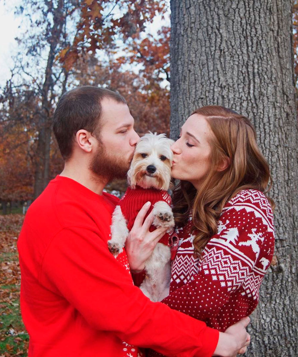 Nada mejor que compartir estilismo con tu familia, ¿no crees? Con jerseys de tonos rojos y blancos, al más puro estilo Papa Noel, podemos ver a esta pareja con su perro, al que han vestido a tono con ellos.
