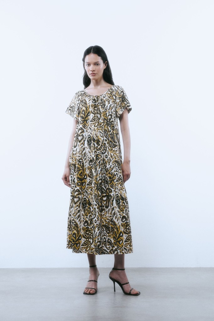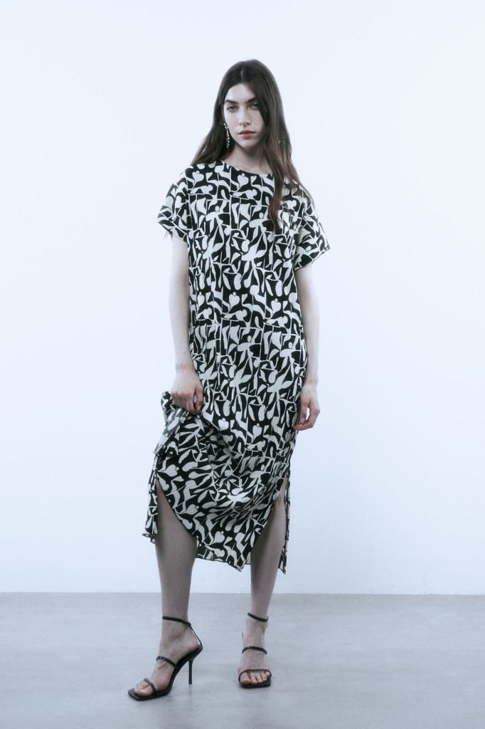 Estos vestidos tipo túnica son, sin duda, los que más veremos en la nueva colección de Sfera. Son perfecto para las mujeres de +50 porque cuentan con una silueta recta, holgada y cómoda, además de un largo midi sofisticado y un estampado blanco y negro ideal. ¿Otros de sus puntos fuertes? Un precioso escote en la espalda y su precio (17,99 euros).