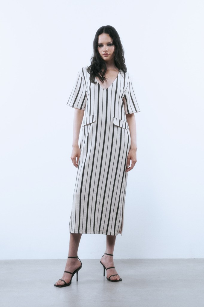 Este otro vestido de rayas de la nueva colección de Sfera es súper favorecedor. Las rayas verticales estilizan, y su silueta recta y holgada es cómoda. Cuenta con mangas cortas anchas y escote en pico, además de un detalle de solapas con falsos bolsillos (19,99 euros).