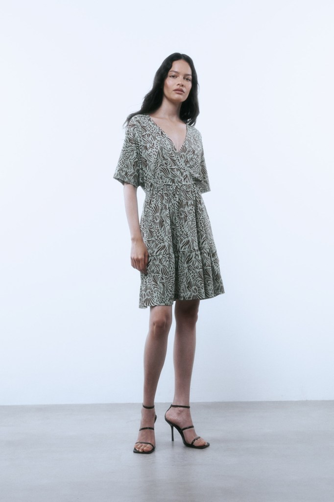 Si eres más de vestidos cortos, esta propuesta de la nueva colección de Sfera será tu favorito. Cuenta con un estampado tropical ideal para aprovechar los últimos días de verano, y su silueta es ancha tanto en la parte de las mangas como en la falda. Otros detalles a destacar son su cuello de pico, su volante en el bajo y su precio, todo un chollo (17,99 euros).