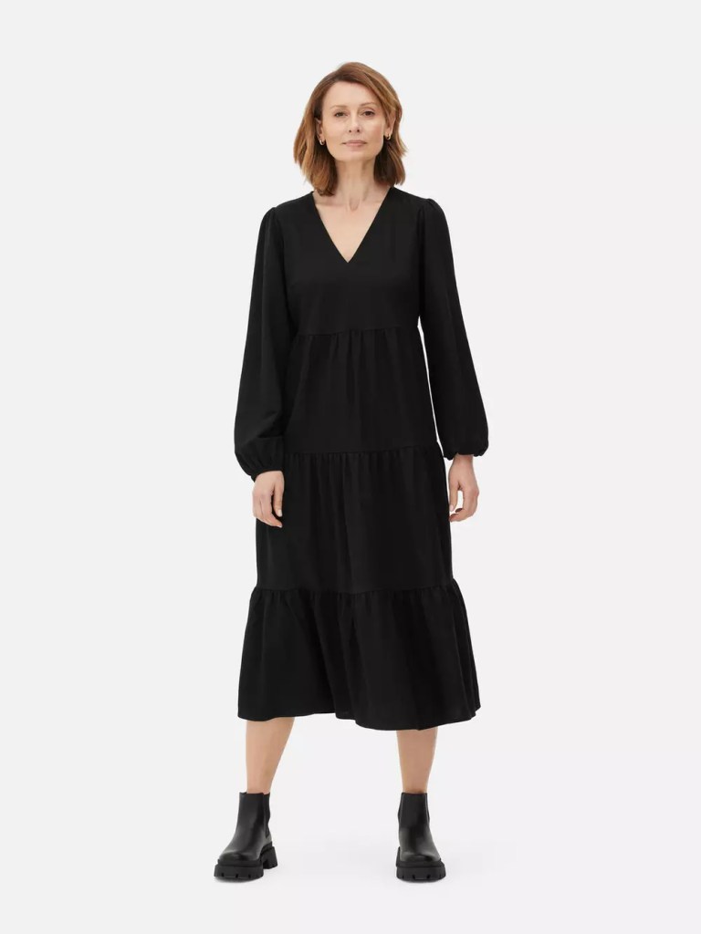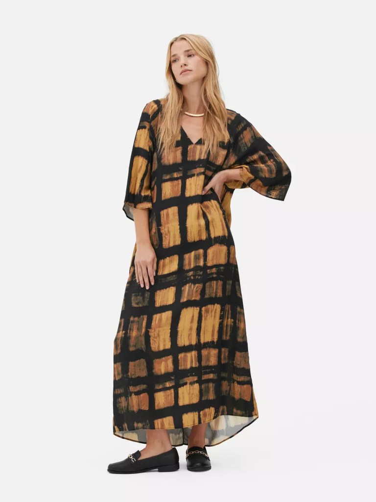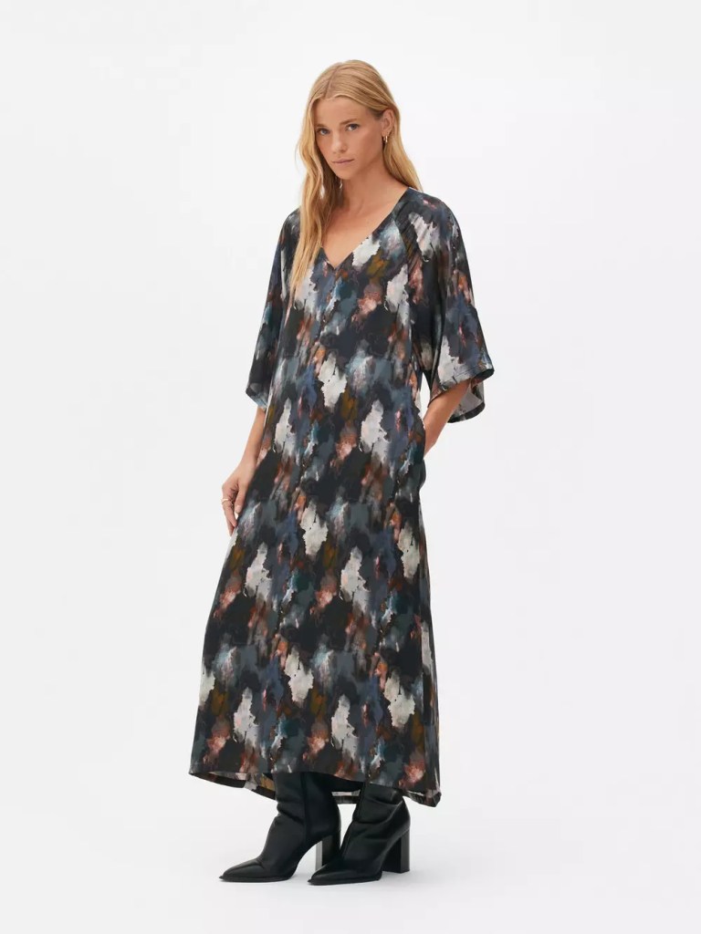 Por aquí tenemos otro de esos modelos que triunfan entre las mujeres +50, y no nos extraña nada. Este vestido largo de Primark cuenta con un diseño extra holgado que abraza incluso sus mangas murciélago. Nos parece súper sofisticado y formal para ir a la oficina con botas de tacón, e igual de ideal para ir a cenar por la noche con el mismo calzado. Además, su estampado con tonos oscuros estiliza mucho y su precio es asequible (28 euros).