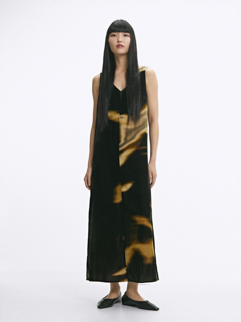 Comenzamos con una propuesta que nos parece sofisticada pero súper diferenciadora. Hablamos de este vestido sueltecito de Parfois con fondo negro y con un estampado degradado que es ideal para todo evento de Navidad: desde una comida de empresa hasta Nochebuena. Como ves, es cómodo al tener una silueta holgada y recta, y lo único que es de manga sisa, así que puede quedar ideal con una chaqueta dorada. Además, este vestido súper barato (45,99 euros).