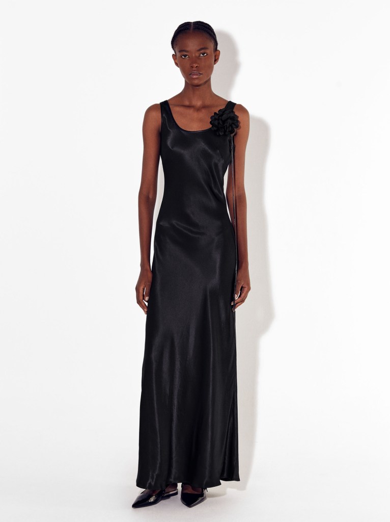 Como en toda colección festiva, no podía faltar en la propuesta de Parfois un vestido sueltecito con acabado satinado. Al tener ese color negro y su silueta fluida estiliza un montón, y además es súper elegante para Nochevieja. Un detalle súper bonito es que cuenta con una flor con lazo del mismo tejido, lo que le aporta un toque aún más sofisticado. Este vestido que seguro ya están fichando las mujeres +50 porque es asequible (49,99 euros), puede quedar ideal con una blazer metalizada.