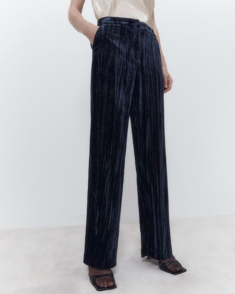 Nosotros aconsejamos combinar este conjunto de terciopelo de la colección de fiesta de El Corte Inglés o con piezas súper oscuras, como el propio azul noche o el negro, o bien con prendas o calzado en tonos claros para crear contraste. Por ejemplo, nos encanta la blusa satinada en color beis con la que se combina en la fotografía, ya que el contraste de estos dos materiales queda súper bien y aporta un toque glamuroso y festivo perfecto para eventos de Navidad como Nochebuena o fin de año.