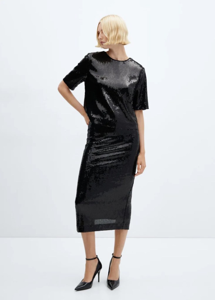 Fin de año es sinónimo de lentejuelas, así que cuando hemos visto este conjunto de Mango no nos hemos podido resistir a traéroslo. Es súper elegante por su color negro y su tejido de lentejuelas, y cuenta con un diseño recto con cuello redondo y manga corta (29,99 euros). Mientras que la falda tiene un diseño midi con cintura elástica que resulta súper favorecedor (35,99 euros). Como ves, este conjunto no es nada caro y además es súper arreglado para Nochevieja.