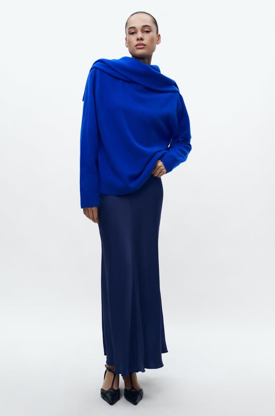 Sin duda, uno de nuestros modelos favoritos y más elegantes para Navidad es esta favorecedora falda satinada de Zara. Es más larga que las anteriores, y su sofisticado color azul noche es muy propio para la ocasión. Como característica a destacar, su acabado en línea evasé hace que estilice un montón. Por ejemplo, nos encanta como queda con ese jersey azul eléctrico que lleva la modelo, aunque también es perfecta para una blusa color champán. Y, en este caso, vuelve a estar tirada de precio (29,95 euros).