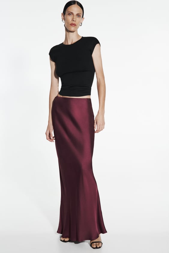 Para dar fin a esta selección de las faldas satinadas más bonitas de Zara para fin de año que las mujeres +50 están agotando porque son baratas y estilizan, una que es larga hasta los pies. Esta pieza festiva en color burdeos es perfecta para llevar con tacones y para crear looks súper elegantes. Por ejemplo, puede quedar ideal con una chaqueta de brillos y unos zapatos a juego (25, 95 euros).
