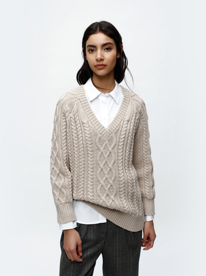Si tu madre, tía o tú misma sois más clásicas, también hay opciones como estas para regalar(te) en la colección de invierno de Lefties. Como se aprecia, se trata de un jersey sueltecito de ochos con un toque retro que nos encanta, pero que a su vez es también ancho y calentito por su punto grueso. Como características a destacar, su cuello en pico perfecto para llevarlo con camisas debajo, además de su color marrón todo que combina con prácticamente todo. De nuevo, es económico al costar menos de 20 euros (19,99 euros).
