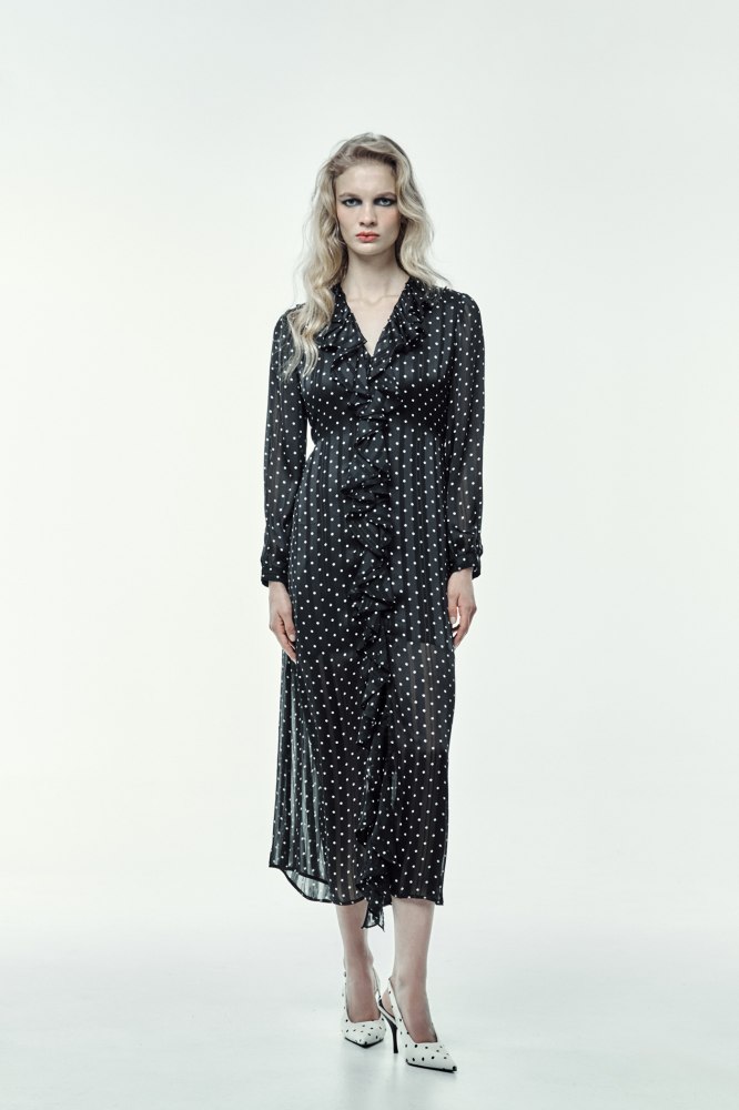 Pero no solo veremos este estampado en tendencia en camisas, ya que encontramos otras prendas de lunares en la nueva colección de Sfera. Por ejemplo, este vestido sueltecito que será todo un objeto de deseo entre las mujeres +50. ¿La razón? Estiliza mucho por su color negro y su tejido fluido, pero es que además es súper elegante para las ocasiones más especiales. También cuenta con detalles de volantes por todo el diseño, así que no puede estar más a la moda. En este caso, su precio es superior (49,99 euros).