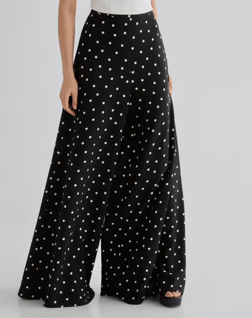 El conjunto, diseñado para destacar y estilizar la figura, consta de una camisa holgada con un lazo anudado al cuello, combinada con unos pantalones plisados que añaden un toque de sofisticación. Lo que realmente hace que este conjunto sea extraordinario es su estampado de lunares blanco sobre fondo negro, que añade un toque de elegancia y frescura al look general. La elección del estampado de lunares, un clásico atemporal que nunca pasa de moda, demuestra la habilidad de El Corte Inglés para combinar lo tradicional con lo moderno de una manera armoniosa.