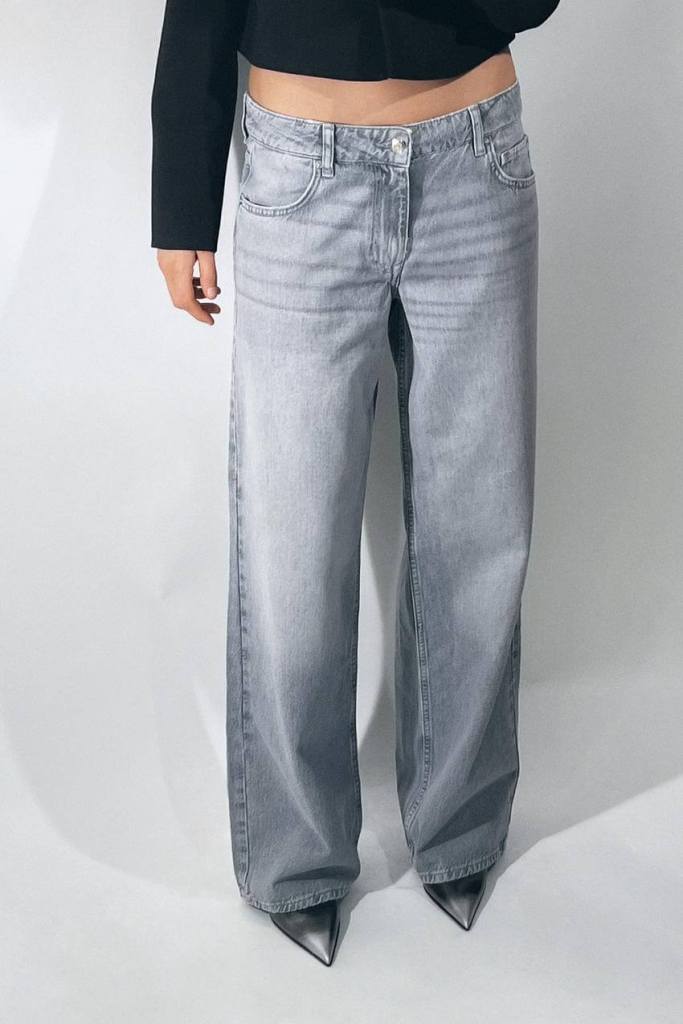 Jeans de tiro medio con cinco bolsillos, efecto lavado, pernera ancha, cierre frontal con cremallera y botón metálico, de Zara (29,95 euros).