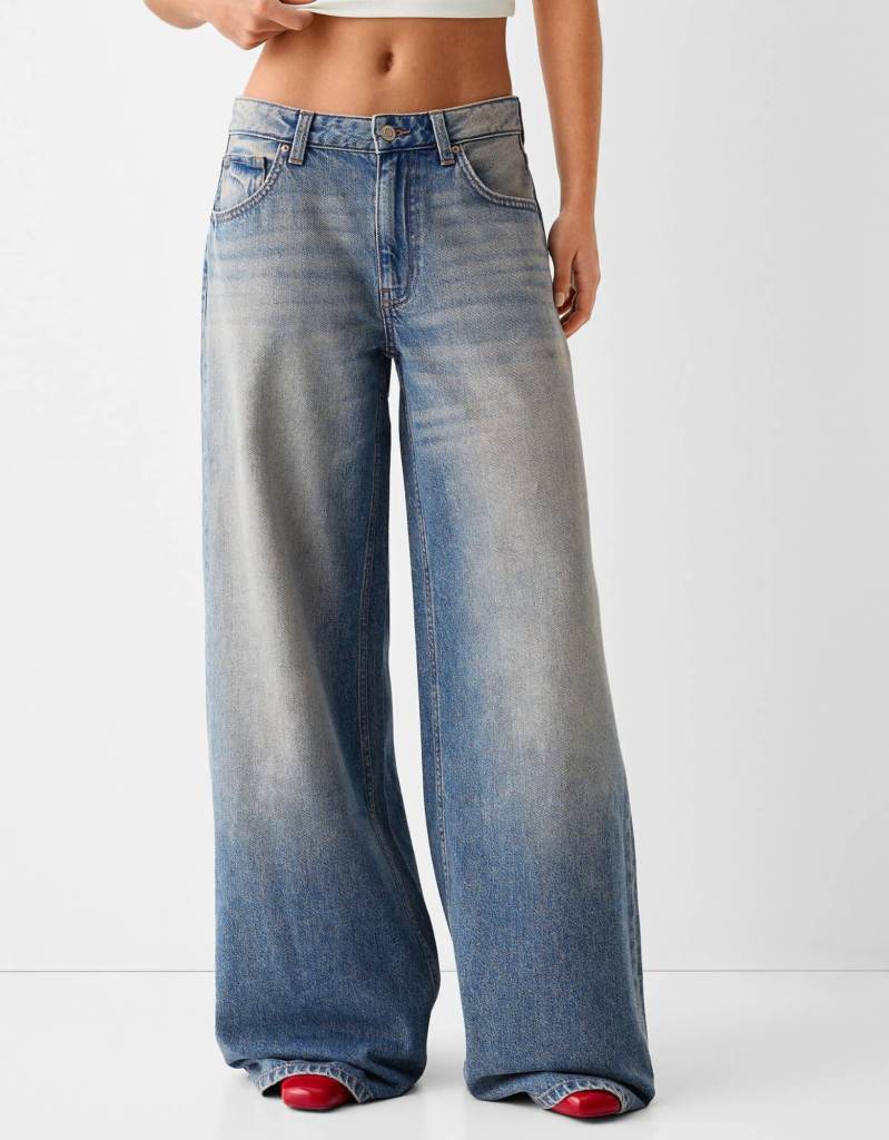 Vaqueros de tiro medio wide leg efecto lavado con bolsillos, de Bershka (25,99 euros).