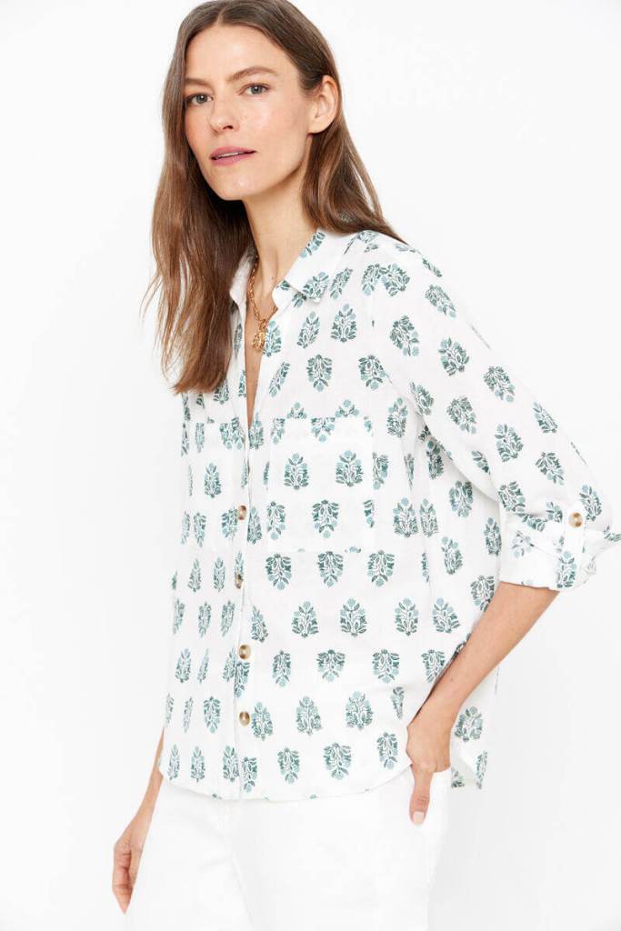 Como propuesta final de la nueva colección de camisas de Cortefiel, obviamente no podía faltar una blusa de flores, indispensable cada primavera entre las mujeres +50. Es blanca con flores verdes, así que quedará genial con partes inferiores en el color blanco. Su algodón rústico es perfecto para la primavera, y el cuello camisero desmentido es muy favorecedor. De nuevo, esta prenda es holgada, así que resulta cómoda para el día a día (39,99 euros).