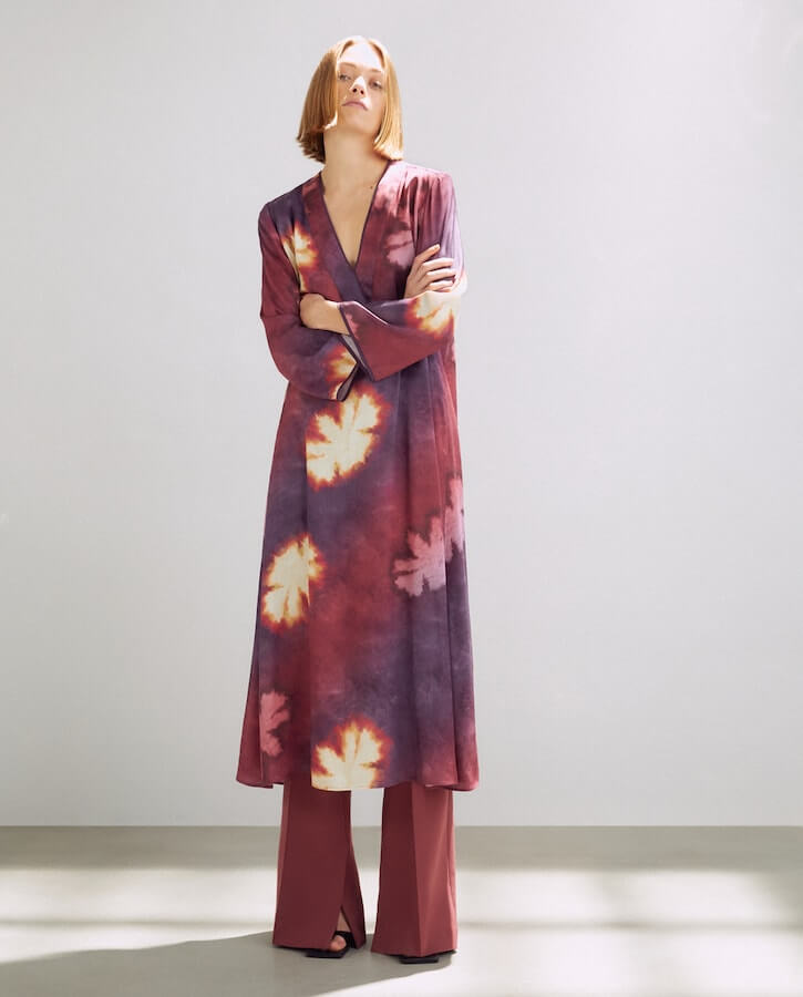Para las que busquen una prenda realmente cómoda, que no se ajuste por ningún lado y que estilice a su vez, en la sección de Woman Limited de El Corte Inglés encontramos este vestido de invitada tipo caftán que cumple con estos requisitos. Este está causando furor entre las mujeres +50 porque es holgado a la par que elegante gracias a esa silueta midi con cuello pico y a un estampado tipo tie dye con tonos rosas y malvas. Eso sí, nos encanta para llevar sobre un pantalón campana en bodas, bautizos y comuniones, como en la imagen, dándole un toque más arreglado (160 euros).