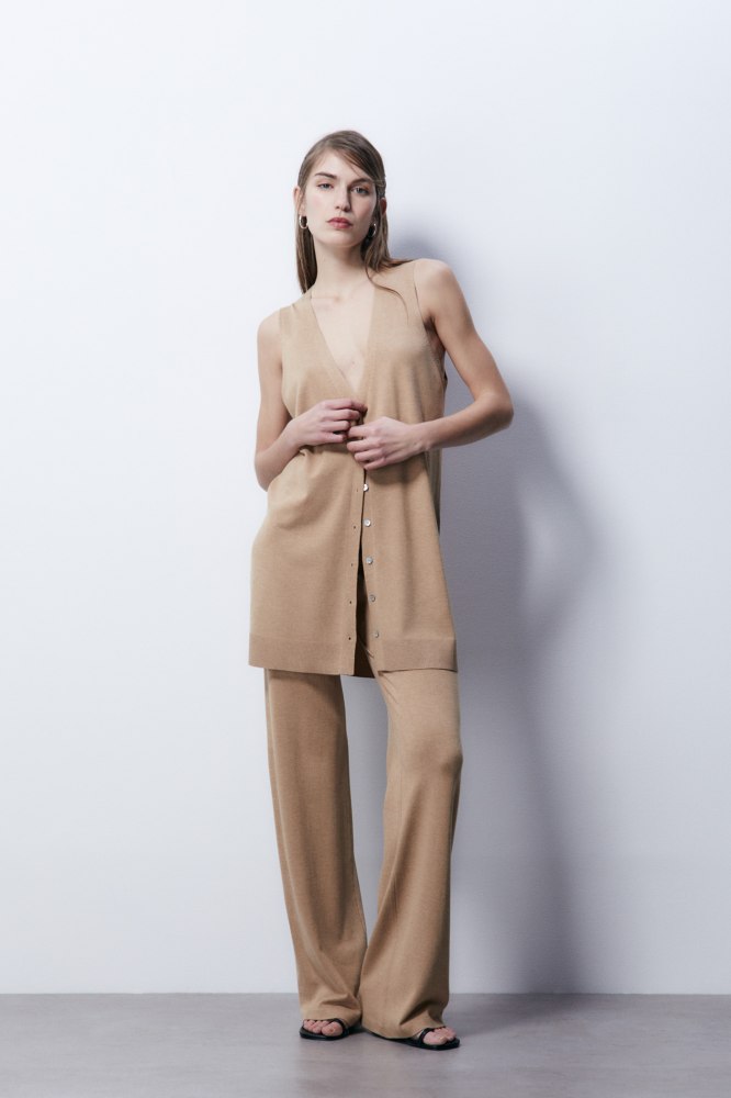 En primer lugar es el tejido de punto fino. Es ideal si te sientes cómoda llevando punto hasta en primavera. El chaleco no tiene mangas y es largo, mientras que los pantalones son anchos y del mismo tejido. Lo mejor de todo es el precio porque lo puedes conseguir por menos de 40 euros, las dos partes del conjunto.
