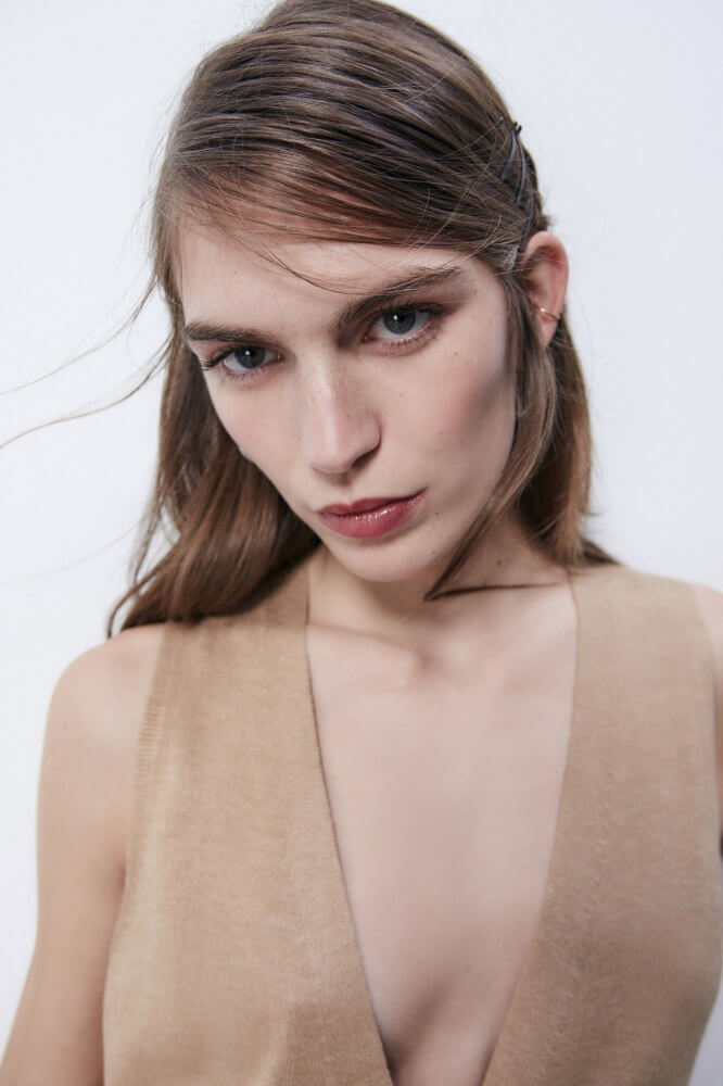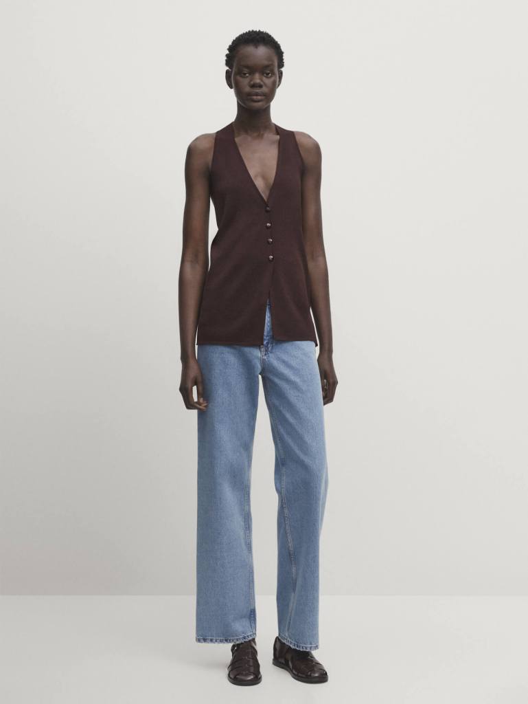 En un tono más oscuro y super fresquito es este chaleco de Massimo Dutti -49,95 euros-. Tiene un escote en pico y unos botones dorados para complementar con looks frescos nocturnos.
