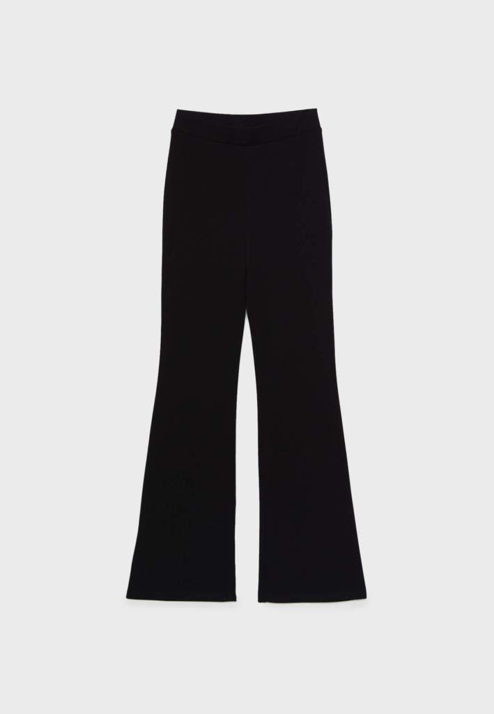 La comodidad de este look se sublima con unos pantalones de campana, anchos y largos que estilizan muchísimo la pierna sin necesidad de llevar tacones. Demet Özdemir lo sabe, y por eso opta por ellos para patear Madrid, ya que son cómodos al ser elásticos y favorecedores. Encontramos un modelo muy similar en Stradivarius, como se aprecia en la imagen superior (19,99 euros).