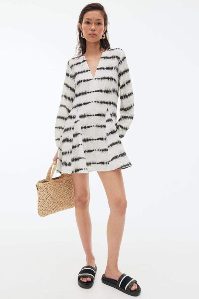 Y, por supuesto, no podíamos no traer uno de los vestidos fresquitos con silueta corta que más está arrasando de cara al verano: este de H&M en blanco y negro. Con cuello redondo, escote en V y mangas globo largas con elástico fino en los puños, tiene una falda acampanada con nesgas para dar un toque de volumen. Pero también cuenta con un cinturón de anudar extraíble con diseño trenzado por si prefieres ajustarlo a la cintura (25,99 euros).
