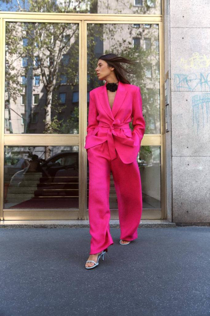 Blazer de cuello solapa y manga larga con hombreras (59,95 euros) y pantalón de tiro alto con pinzas delanteras (39,95 euros) ambos de color fucsia, de Zara.