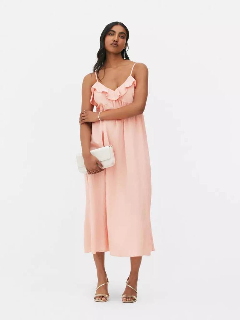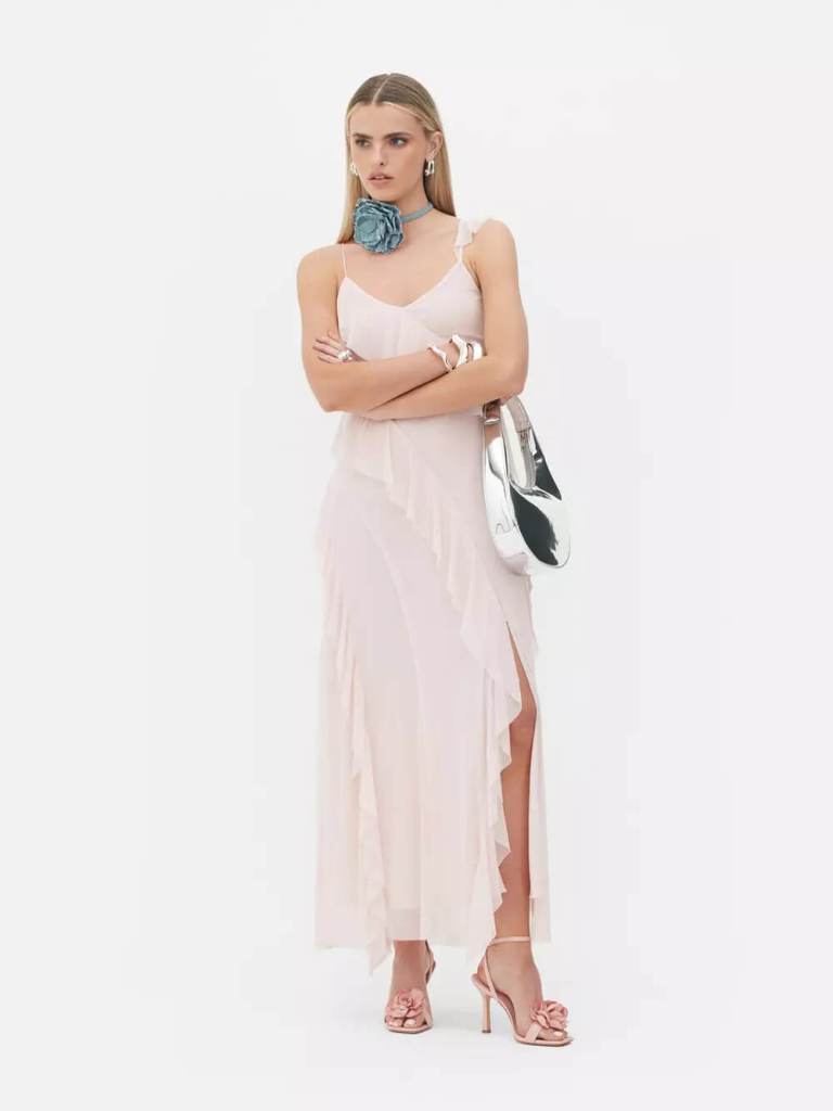 Este tipo de vestidos de invitada ligeros con volantes son un clásico en Mango, y ahora Primark propone esta opción en rosa pastel que es romántica y femenina. Con un diseño largo, cuello en pico y tirantes finos, es una opción ideal para aquellas que busquen estilizar su figura aportando volumen a la parte inferior del cuerpo. Esta sofisticada opción low cost cuesta solo 28 euros.