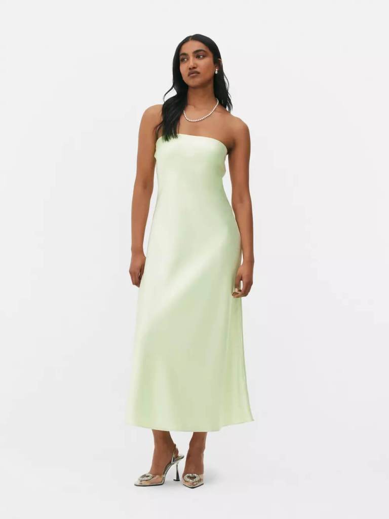 Otras de las tendencias absolutas de la primavera son las prendas satinadas, y como prueba os dejamos este vestido de invitada súper barato de Primark (25 euros). Cuenta con una silueta recta y nada ajustada que favorece la figura, y tiene un atrevido escote palabra de honor que puede quedar genial con una capa de gasa o un fular del mismo tejido. Su tono verde pastel lo hace de nuevo un modelo dulce y bonito para las más románticas.