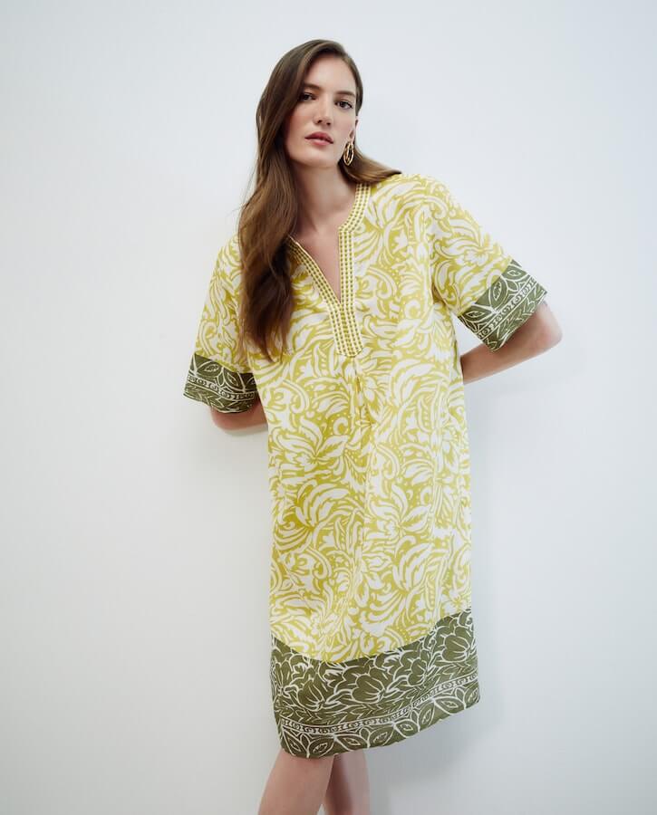 Aunque los vestidos túnica suelen ser midi o largos, en El Corte Inglés arrasa entre las mujeres +60 este corto. En primer lugar porque es cómodo al no ser nada ajustado, pero es que es súper ponible en verano gracias a su estampado alegre de flores bicolor. Con el amarillo y el verde se aporta un toque rejuvenecedor y moderno al look (59,99 euros).