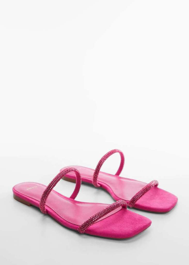 Para presumir no hay que sufrir, incluso ni eventos. Con sandalias planas arregladas y elegantes como estas de Mango Outlet, desde luego que no. Son sencillas porque solo cuentan con dos tiras, pero al ser de color fucsia y tener esos detalles de strass se postulan como una opción ideal para bodas, bautizos y comuniones. Sobre tono si le quieres dar una nota de alegría y diversión a tu estilismo. Además, son bastante asequibles también (29,99 euros 23,99 euros).
