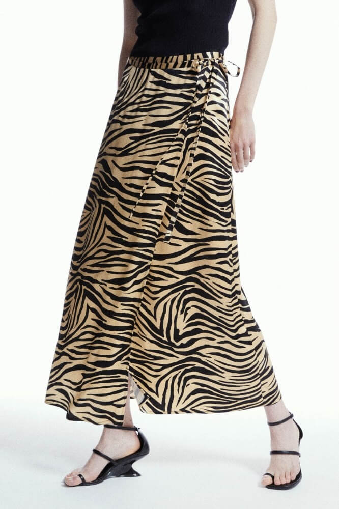 Como en todas las prendas, en las faldas midi también impera la tendencia del animal print. Puedes llevar la que está más a la moda, la del estampado de leopardo, o también apostar por otros prints, como este de cebra. Este modelo de Sfera cuenta con una silueta cruzada que afina la cintura, y además su detalle de lazo le aporta un toque diferencial. Nos encanta para llevarla con una camiseta básica negra y unas sandalias planas de tiras. Y es bastante asequible (35,99 euros).