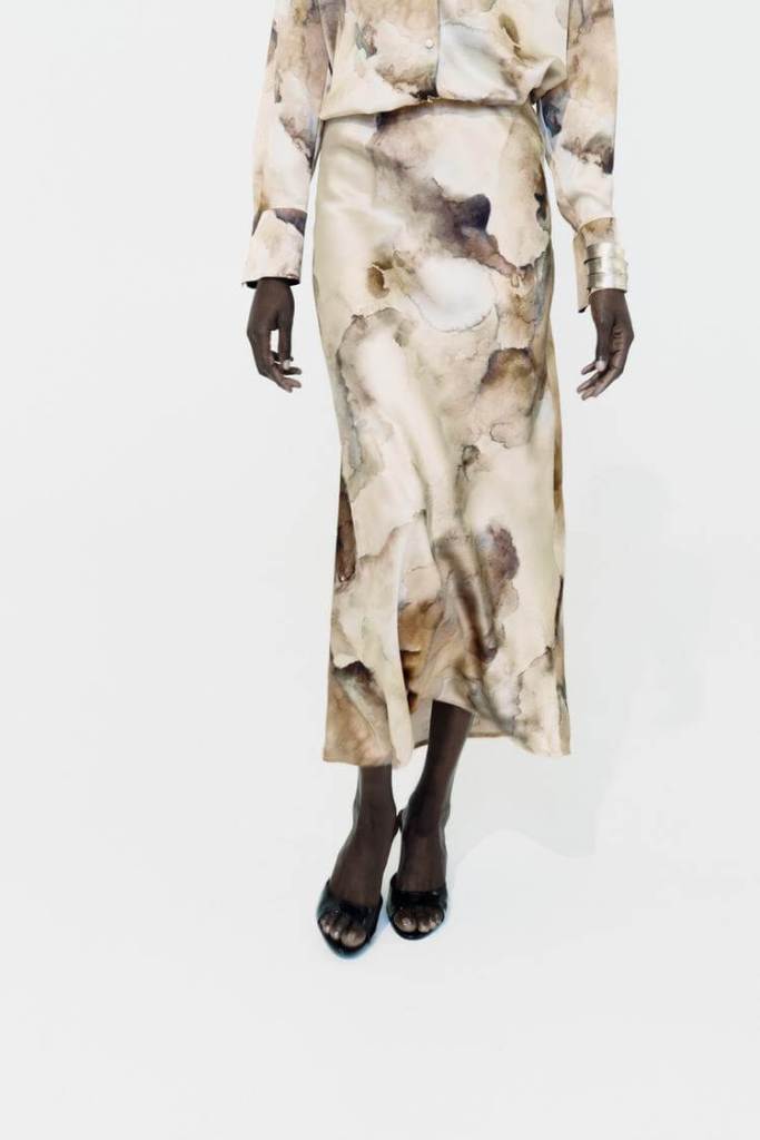 En Zara son muchísimas las faldas midi que triunfan, pero sin duda las que más afinan la silueta son modelos satinados como este. Además, al contar con cintura elástica también resultan cómodas. En este caso, su estampado efecto mármol es elegante, y la podemos llevar tanto con su camisa a juego como un top básico marrón y sandalias pala a juego. Y, e nuevo, es una opción bastante versátil para lo barata que es (27,95 euros).