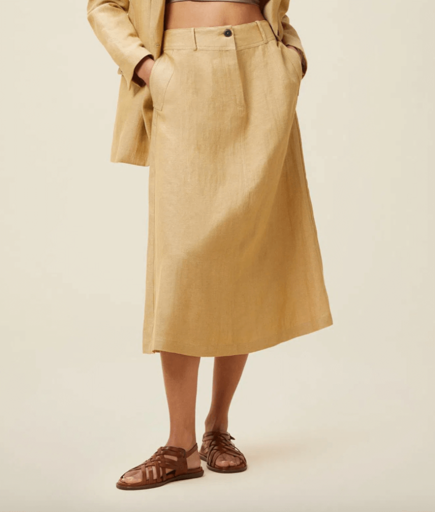 Ya hemos mencionado anteriormente que el lino es uno de los tejidos que más triunfa en verano porque es súper ligero, así que faldas midi como esta de Pomandère son ideales para estos meses. Con un estilo rústico que la hace perfecta para llevar un total look en las mismas tonalidades tierra, esta es súper favorecedora y resulta confortable para el día a día. Nos encanta para llevarla con una camiseta blanca y unas sandalias de tiras en color camel (284 euros).