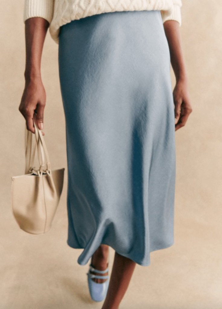 El azul cielo es el color de la temporada, así que esta falda midi de Sézane es una opción que tener en el radar. Al tener un material de efecto satinado es perfecta tanto para lucir en ocaciones más especiales con blusa y sandalia de tacón sensato, como a diario con una camiseta beis y sandalias planas a conjunto. Esta favorece mucho por su diseño ligeramente acampanado y la buena caída de su tela (110 euros).